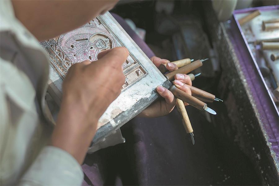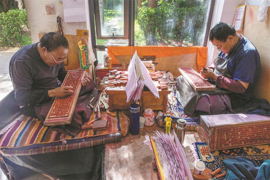 Carvers of Tibetan woodblock, a printing tradition that has been passed down for more than 340 years, work in their studio in Lhasa, Southwest China's Xizang autonomous region. JIANG FAN/TENZING NIMA QADHUP/XINHUA