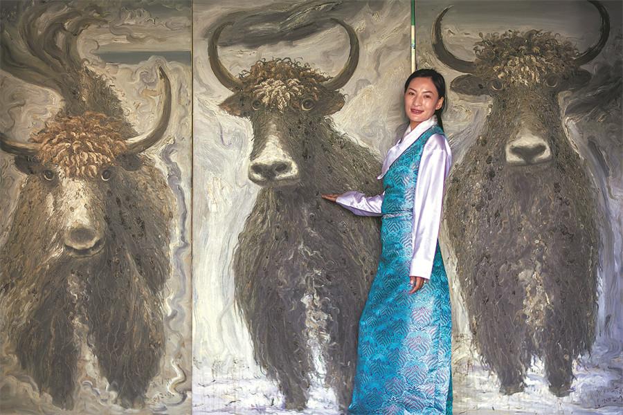 Dressed in traditional Tibetan costume, a woman poses in front of a painting in Lhasa. JIANG FAN/TENZING NIMA QADHUP/XINHUA