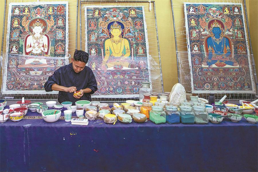 A young man concentrates on his thangka artwork. The art was included on the national intangible cultural heritage list in 2006. JIANG FAN/TENZING NIMA QADHUP/XINHUA