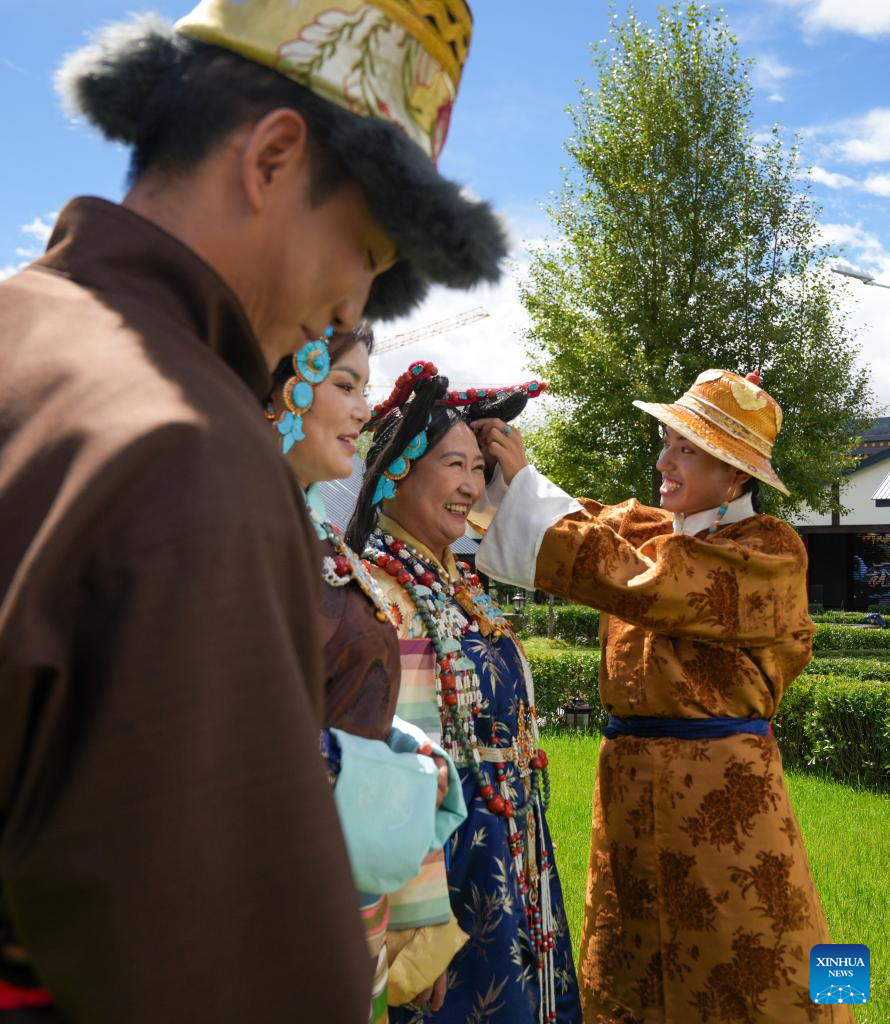 Padruk Tendar (1st R) adjusts Tibetan costume accessories for a model in Lhasa, southwest China's Xizang Autonomous Region, Sept. 9, 2025. (Xinhua/Jigme Dorje)