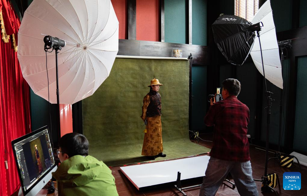 Padruk Tendar wearing Tibetan costume poses for photos during a studio photoshoot in Lhasa, southwest China's Xizang Autonomous Region, Sept. 9, 2025. (Xinhua/Tenzin Nyida)