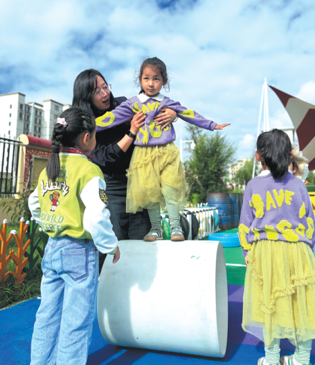 Lin Aili, a teacher from Nanjing, Jiangsu province, plays games with children at a kindergarten established with the help of the province in Lhasa, Xizang autonomous region. (Photo: China Daily)