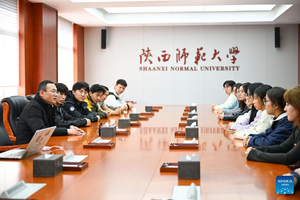 Shi Lei (1st L) communicates with representatives of students who are about to set off to southwest China's Xizang Autonomous Region for teaching practice, at Shaanxi Normal University in Xi'an, northwest China's Shaanxi Province, Jan. 7, 2026. (Xinhua/Zhang Bowen)