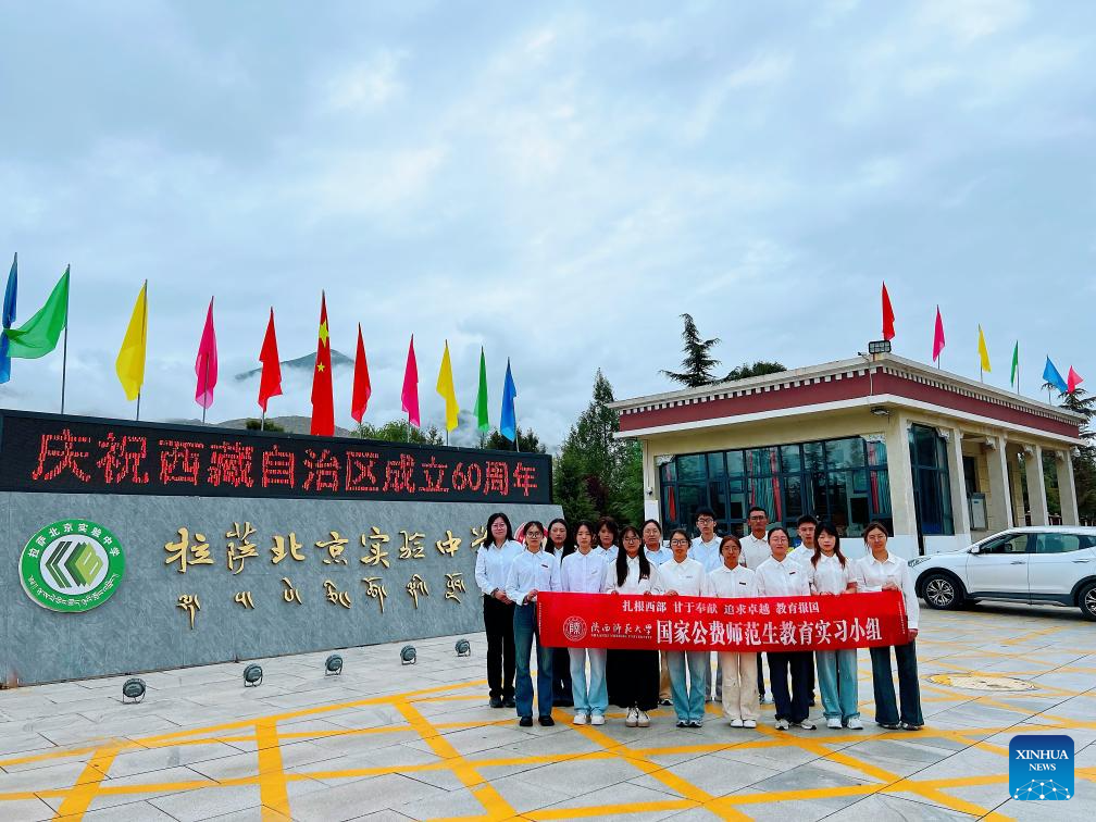 Members of a teaching-practice group of students from Shaanxi Normal University pose for a group photo at an experimental middle school in Lhasa, southwest China's Xizang Autonomous Region, Aug. 26, 2025. (Xinhua)