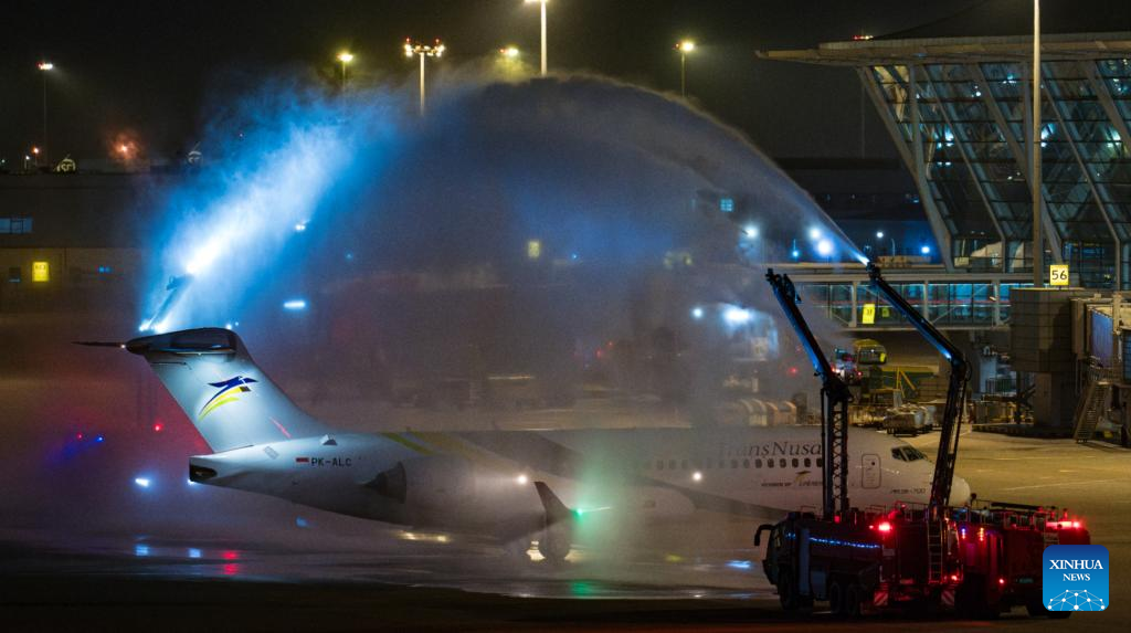 A C909 jetliner of an Indonesian airline lands at Shanghai Pudong International Airport in Shanghai, east China, May 8, 2025. Saturday marks the ninth anniversary of the commercial operation of China's domestically developed regional jetliner C909. So far, 166 C909 aircraft have been delivered, which have handled over 24 million passenger trips. (Photo by Xu Bingnan/Xinhua)