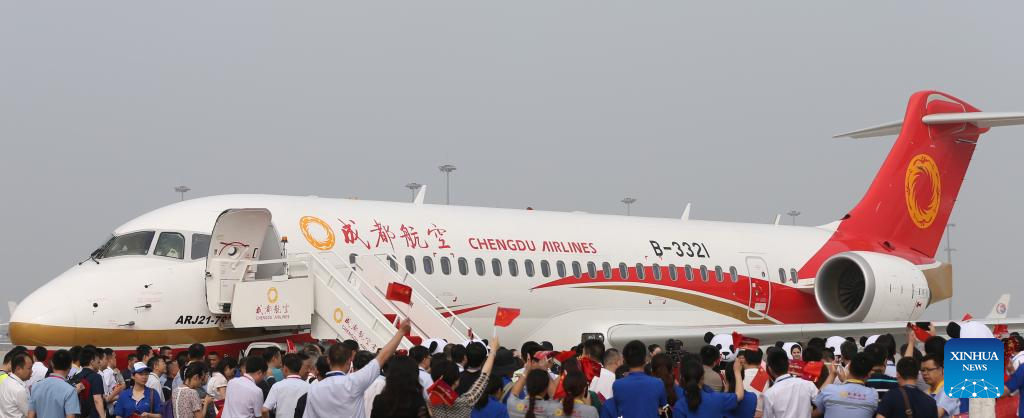 This file photo taken on June 28, 2016 shows the first C909 jetliner beginning commercial operation at Chengdu Shuangliu International Airport in Chengdu, southwest China's Sichuan Province,. Saturday marks the ninth anniversary of the commercial operation of China's domestically developed regional jetliner C909. So far, 166 C909 aircraft have been delivered, which have handled over 24 million passenger trips. (Xinhua/Ding Ting)