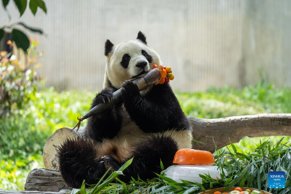 The giant panda Xiao Qiji enjoys delicacies at the Shenshuping giant panda base of Wolong National Nature Reserve in southwest China's Sichuan Province, July 17, 2025. A giant panda birthday season event, hosted by the China Conservation and Research Center for Giant Panda, was held here on Thursday. The much-anticipated giant pandas, including Fubao and Xiao Qiji, met the public and enjoyed delicacies such as carrots, watermelons, etc. (Xinhua/Xue Chen)