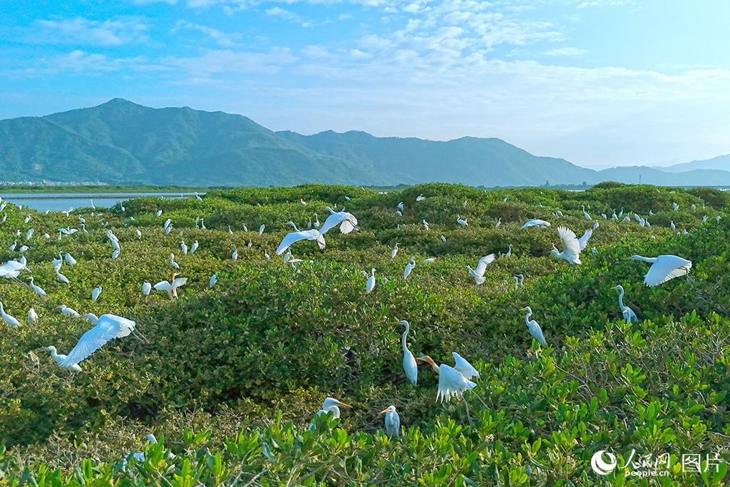Photo taken on July 4, 2025 shows flocks of egrets perching on mangroves in Zhangjiangkou National Mangrove Nature Reserve in Yunxiao county, southeast China's Fujian Province. The nature reserve is the first of its kind in Fujian to be listed as one of the Wetlands of International Importance under the Ramsar Convention on Wetlands. It covers an area of 2,360 hectares, and hosts the most diverse and well-preserved natural mangrove community north of the Tropic of Cancer. With over 160 bird species recorded, including more than 20 key species under national protection, the nature reserve is considered a "bird paradise." (People's Daily Online/Li Changqian)