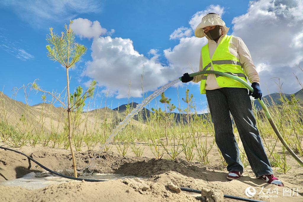 Photo taken on July 25, 2025 shows a worker watering saplings for a greening project launched by Lhasa, capital of southwest China's Xizang Autonomous Region, for its northern and southern mountains. This major ecological restoration initiative aims to transform the city's environment, improving water conservation and controlling desertification through large-scale afforestation. So far, 28,000 mu (about 1,867 hectares) of trees have been planted. (People's Daily Online/Tsering Norbu)
