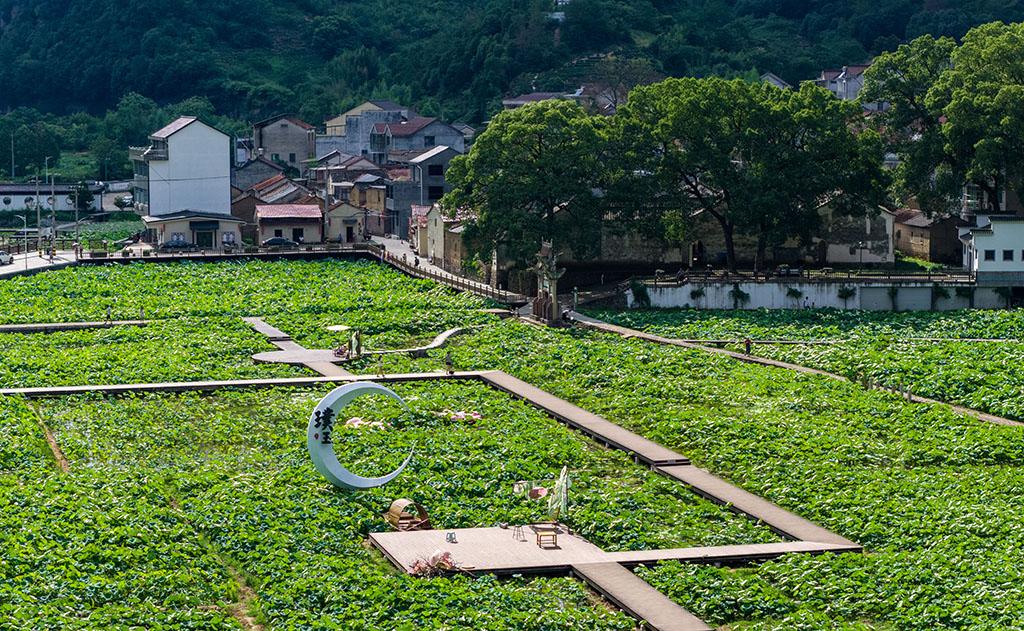 Photo taken on July 9, 2025 shows a stunning view of lotus ponds in Puyu village, Guimen township, Shengzhou city, east China's Zhejiang Province. By promoting integrated development among nearby villages, Shengzhou has fostered distinctive rural industries and drawn a vibrant picture of comprehensive rural revitalization. (People's Daily Online/Zhang Yongtao)
