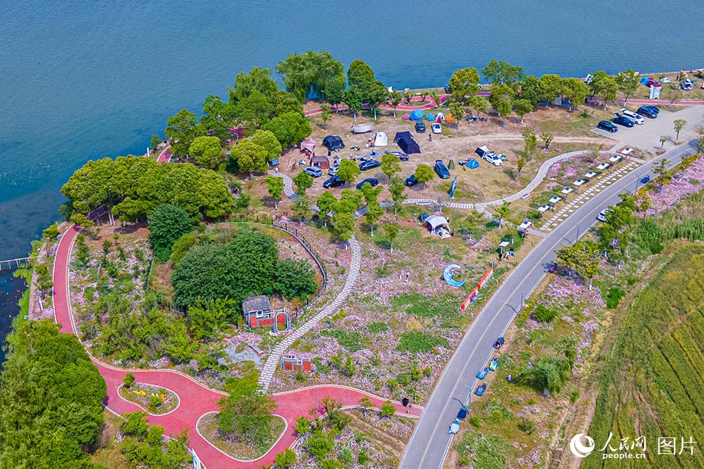 Photo taken on May 4, 2025 shows visitors enjoying leisure activities at Mingjingdang national water conservancy scenic area in Kunshan, east China's Jiangsu Province. Covering an area of 32 square kilometers, the area integrates flood control, water resource management, ecological restoration, and rural beautification, serving as a model scenic area featuring a harmonious relationship between human and water. (People's Daily Online/Wang Chu)