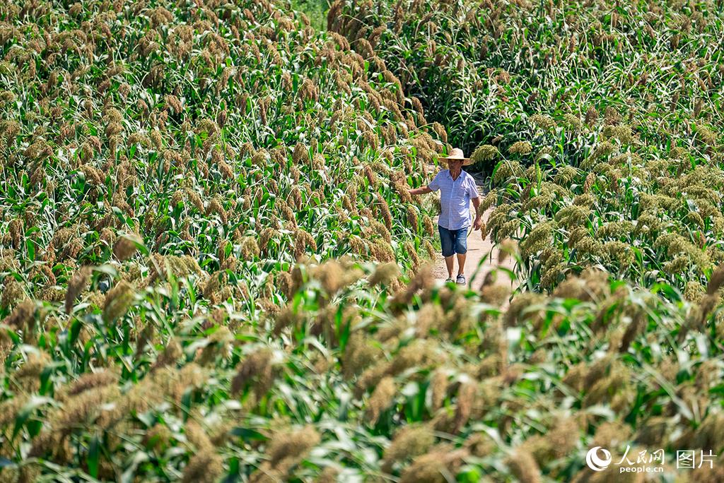 Photo taken on July 29, 2025 shows a farmer checking the growth of sorghum in Maopo village, Changgang town, Renhuai city, southwest China's Guizhou Province. In the past, nearly 40 percent of the village's land was plagued by rocky desertification, severely hampering agriculture. Since 2019, large-scale land improvement projects have transformed fragmented, barren hillsides into fertile, contiguous farmland, greatly boosting productivity. (People's Daily Online/Tu Min)
