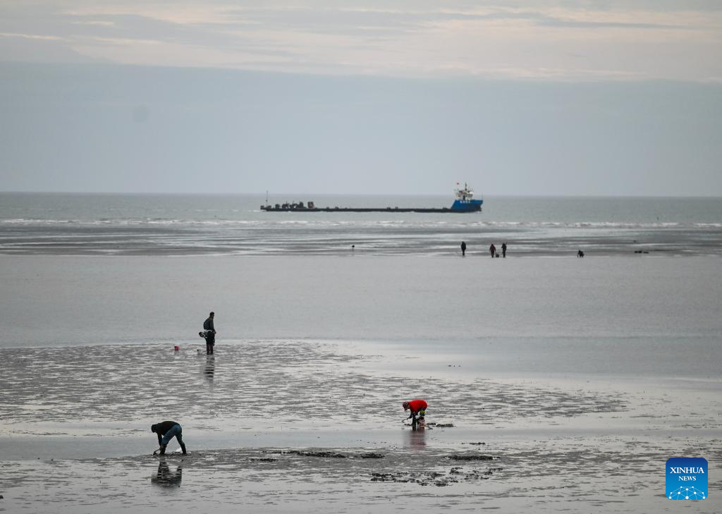 People are seen on the tidal flats in Qidong City under Nantong, east China's Jiangsu Province, Nov. 9, 2024. In recent years, Nantong has scaled up efforts to improve the water conservancy system, coupled with its green development endeavors in river basins and seaside areas. (Xinhua/Ji Chunpeng)