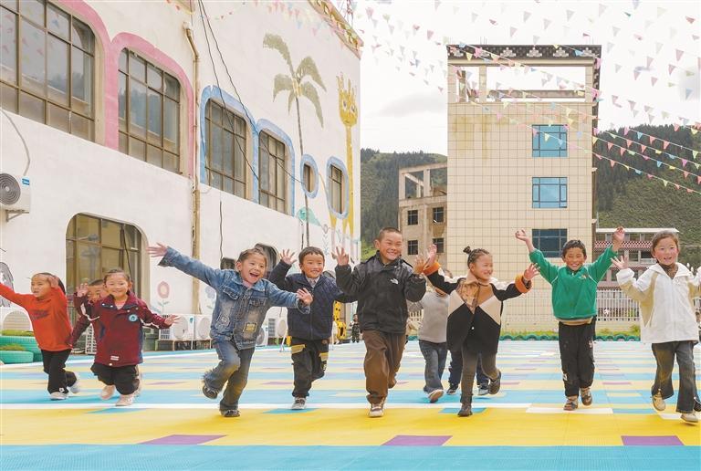 The picture shows children playing happily during break time at Chongqing Bilingual Kindergarten in Riwoqe County, Qamdo City. (Xizang Daily/Danzeng Qunpei)
