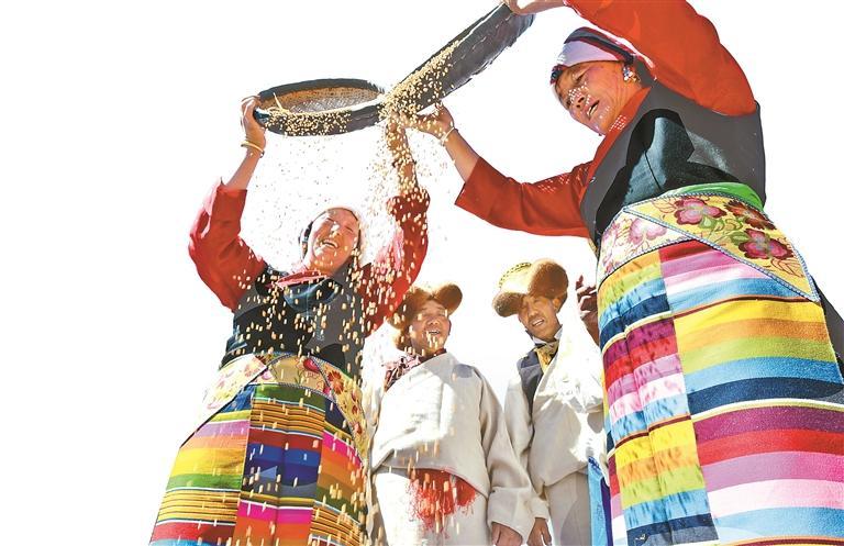 The picture shows villagers in Dianchong Village, Lhunzhub County, Lhasa sorting wheat grains. (Xizang Daily\ Danzeng Lanze)