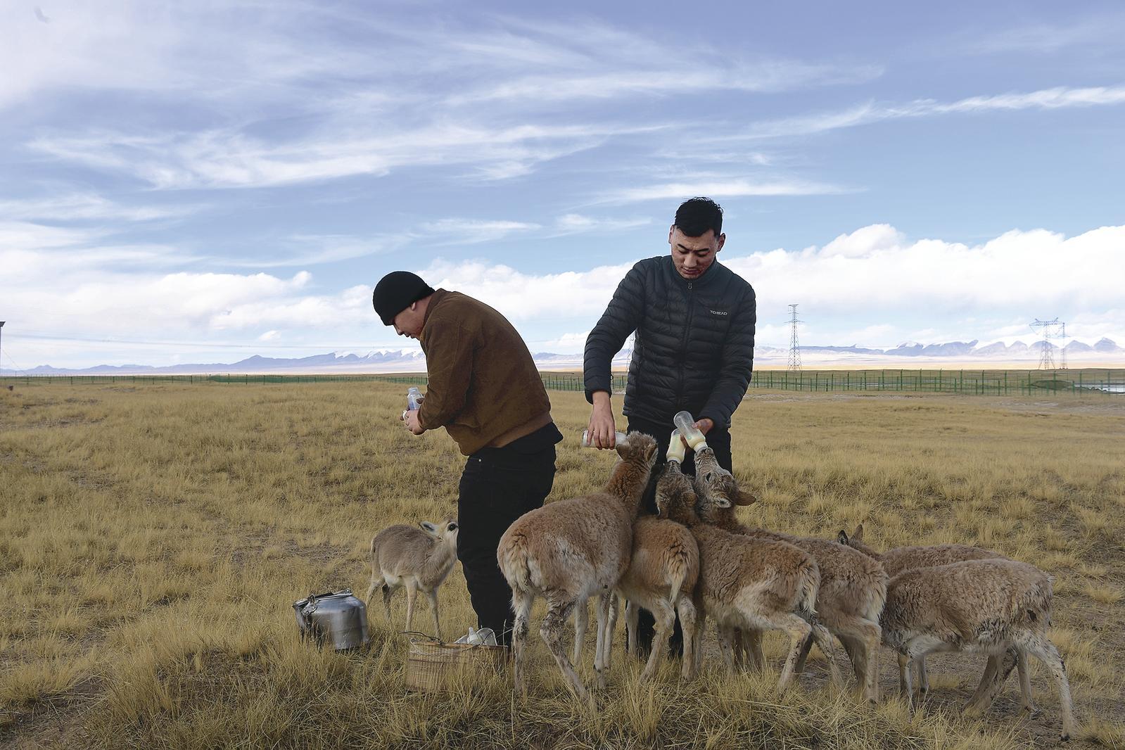 The staff at Sonam Dajie Conservation Station feed and rescue the Tibetan antelopes.