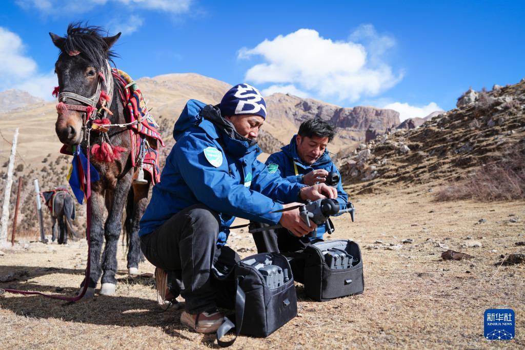 On January 29, Ciding (left) and Gengga were preparing to use drones during a patrol in Angsai Township, Zaduo County, Yushu Tibetan Autonomous Prefecture, Qinghai Province.