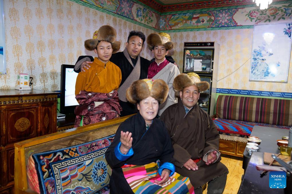 Chocho (1st R) and his family take a family photo at their home in Lhasa, southwest China's Xizang Autonomous Region, Feb. 16, 2026.