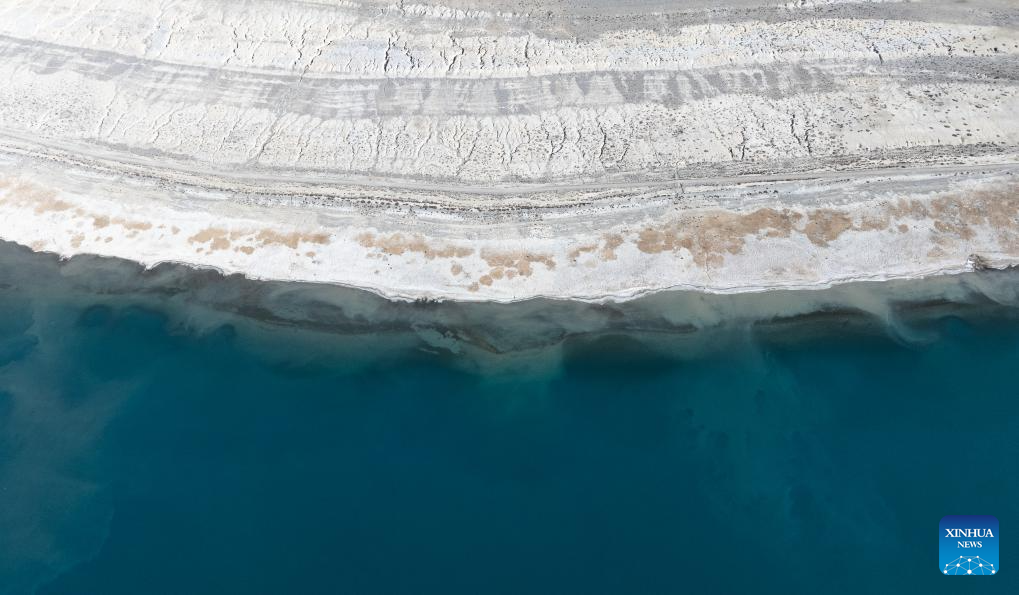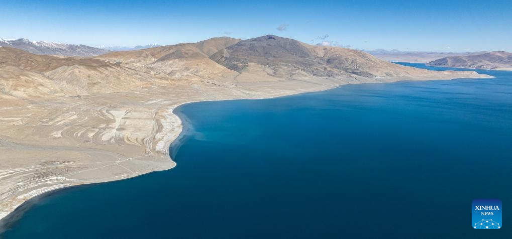 An aerial drone photo taken on Jan. 3, 2026 shows the winter scenery of Baiku Co in Xigaze City, southwest China's Xizang Autonomous Region. (Xinhua/Tenzin Nyida)