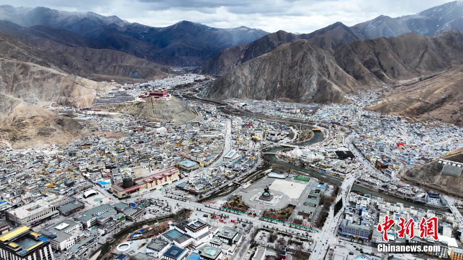 Aerial photography taken on April 14 shows the cluster of buildings in Yushu City, Qinghai Province. Yushu is at the source of three rivers (the Yangtze, the Yellow, and the Lancang River). The urban area is built leaning the mountains with the river winding through the city.