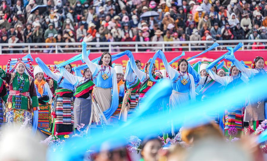 A performance is staged at the opening ceremony of the 2025 edition of a traditional horse racing festival in Nagqu, southwest China's Xizang Autonomous Region, Sept. 5, 2025. (Xinhua/Tenzin Nyida)
