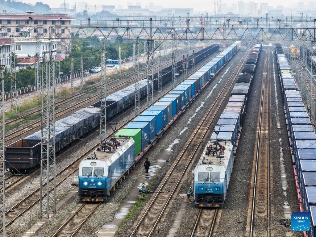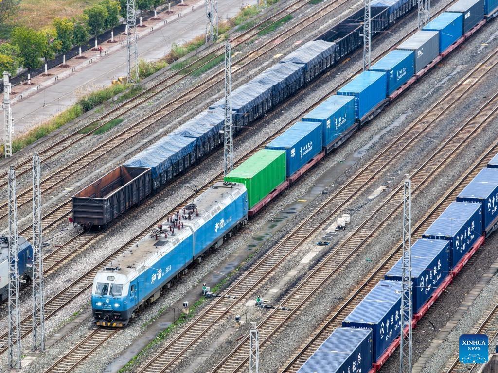 A drone photo shows a China-Europe freight train waiting to depart from Xinglongchang Station in southwest China's Chongqing Municipality, Jan. 1, 2026.