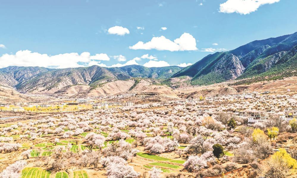 Thanks to the pure and beautiful spring breeze flowing over the highlands, the season for various flowers to bloom has arrived. The Tibet related areas sush as Derong County, Rongbrak County, and Rtau County have become excellent places for flower viewing. Every year, from March to April, these regions have Khambu flowers, pear blossoms, and sweet apricot flowers. Amidst the scenery adorned with various flowers, tourists enjoy the natural beauty, take photos with their phones, or gather in groups to play various games among the flower trees.